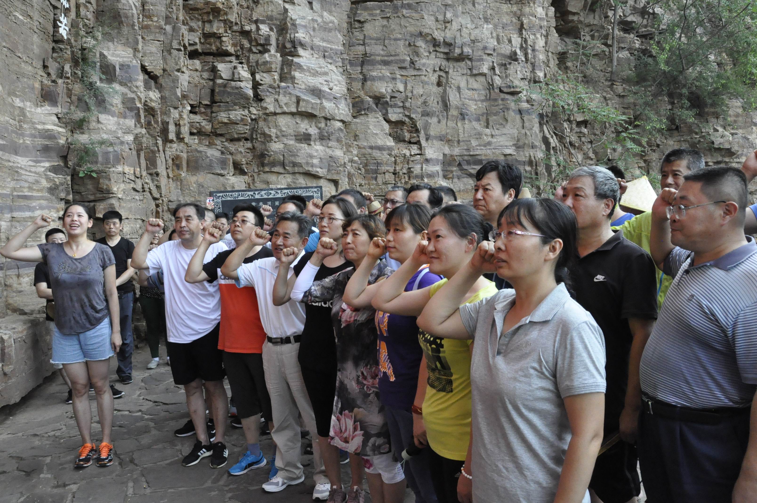 随后,大家来到了红旗渠主干渠的咽喉工程——青年洞。在青年洞前的长渠上,看着千仞峭壁的山洞、堆砌牢固的渠岸、穿山而过的红旗渠水,党员同志们实地见证了红旗渠工程的伟大,再次深切感受到当年共产党员们战天斗地的英雄气概。面对青年洞前的鲜红党旗,全体党员同志们郑重宣誓,重温入党誓词,再一次经受了灵魂和党性的洗礼。