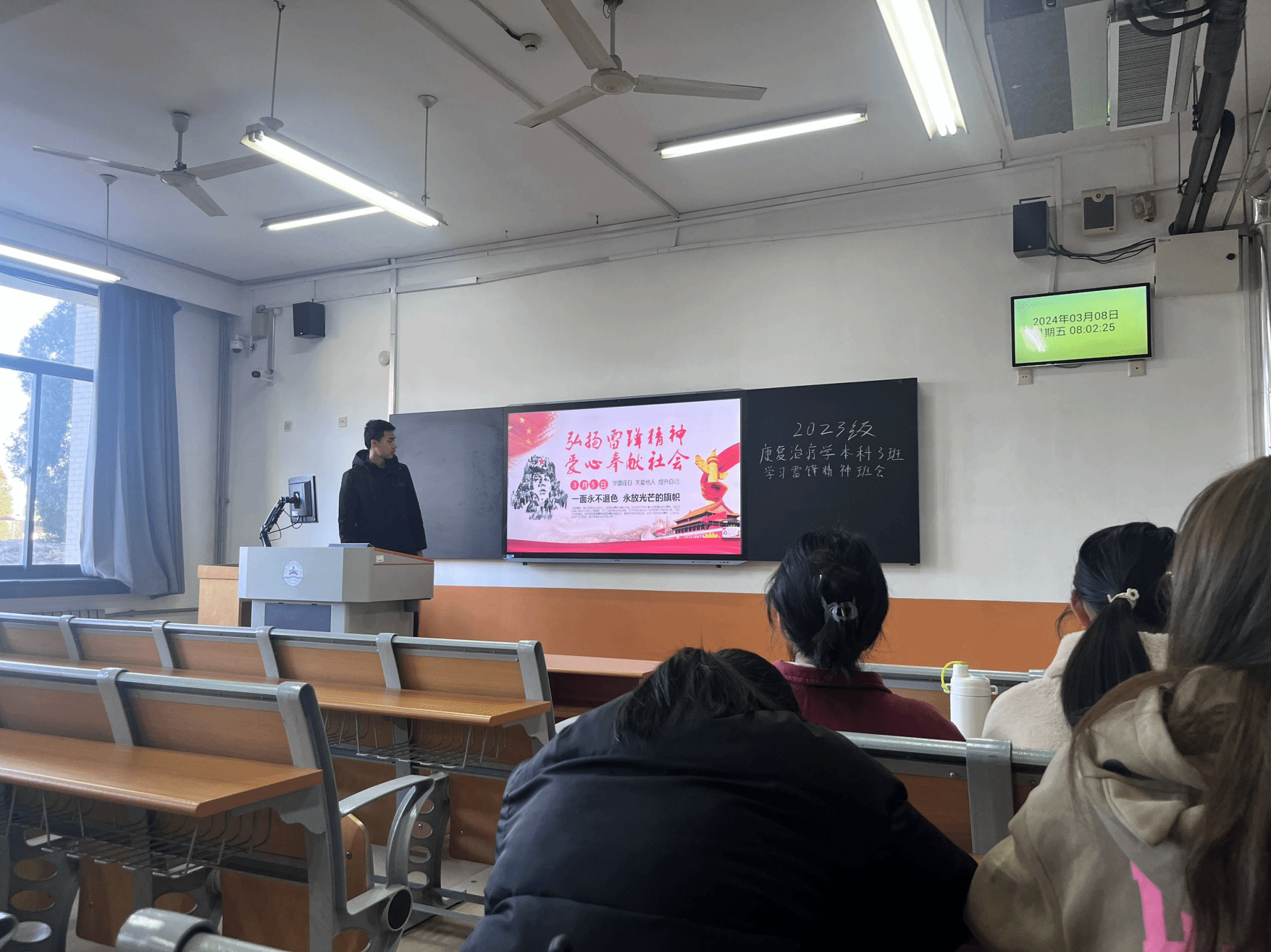 班会上,主讲人介绍3月是雷锋月,雷锋精神的含义从助人为乐的中华民族优秀传统美德,结合雷锋身上“平凡而伟大的共产主义精神”,雷锋精神不仅需要全社会积极学习,更需要每一位无产阶级人士坚持为人民服务的根本宗旨。会后,同学们学习了雷锋无私奉献的伟大精神,增强志愿意向,更加坚信我党造福人民的最终目标。