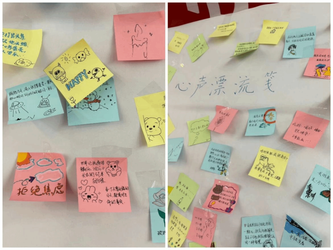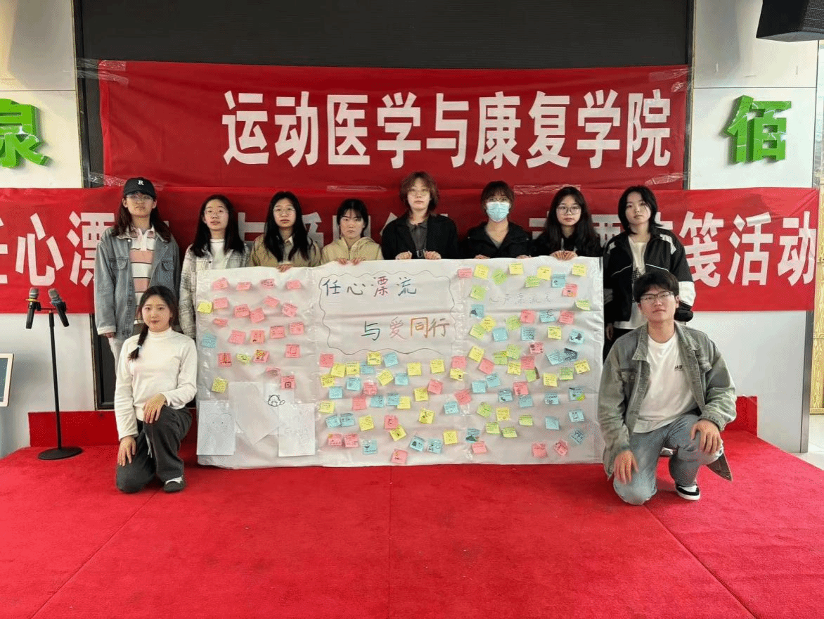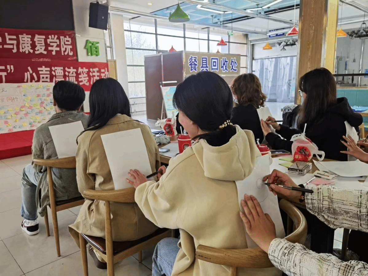 心理协会的成员们早早来到现场进行布置,挂好横幅并准备好“心声漂流墙”、便利贴、画笔等物品。成员们引导路过的同学书写心愿便利贴,并张贴在心声漂流墙上,同学们纷纷写下自己的心声并进行了趣味涂鸦,有的同学直截了当,写下“拒绝焦虑”;也有同学深思熟虑,写下了“世上没有完美,甚至缺少公正,但只要自己努力了就好,不要计较结果”这样的话语。从中我们看到了同学们积极开朗、乐观向上的心理状态,相信他们在前行中也能永远保持这种心态。参与活动的同学进行后背传画游戏,成员们默契配合,共同完成了绘画创作。
