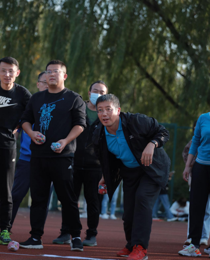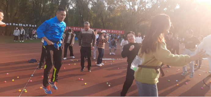 扔沙包游戏,师生们配合默契,负责砸沙包的人员发起猛攻,躲沙包的人员非常沉着,眼睛盯着沙包飞来的方向,左躲右闪,动作敏捷,时不时转身来个海底捞月,一下抓住沙包,呐喊声此起彼伏,场面十分热闹。