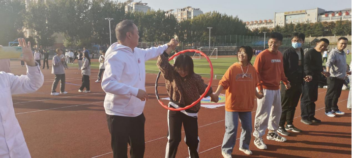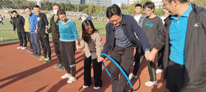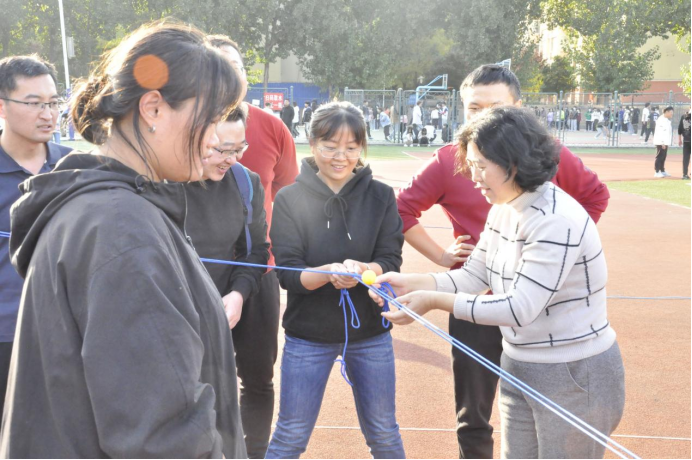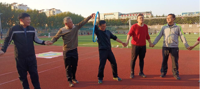 一圈到底,规则是在规定时间内,呼啦圈穿越整个队伍轮次最多的参赛队获胜。师生们手拉手个个身轻如燕,伴随激动又爽朗的笑声,激烈比拼,团结协作,你争我赶。