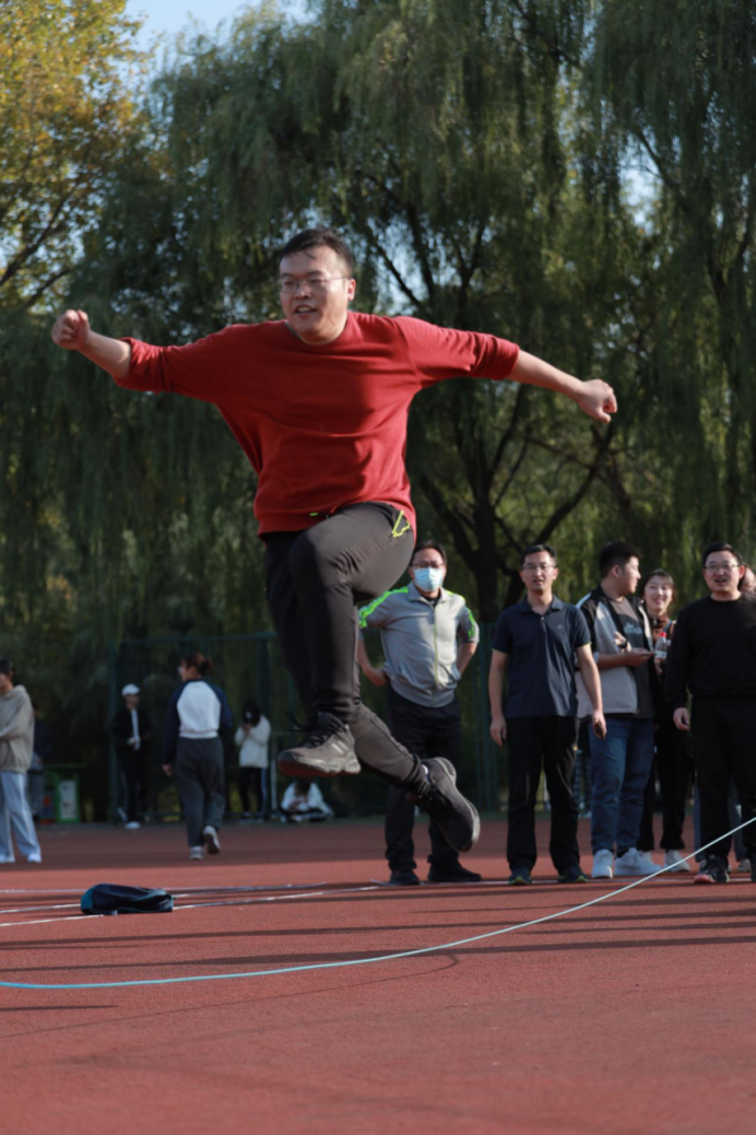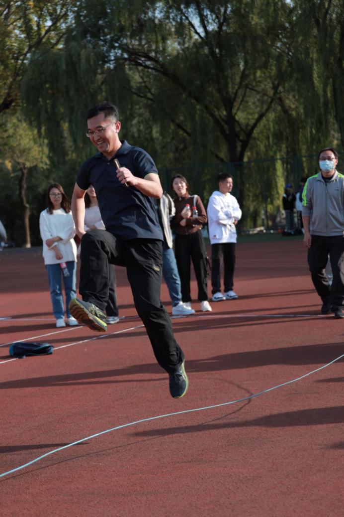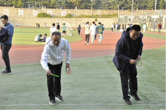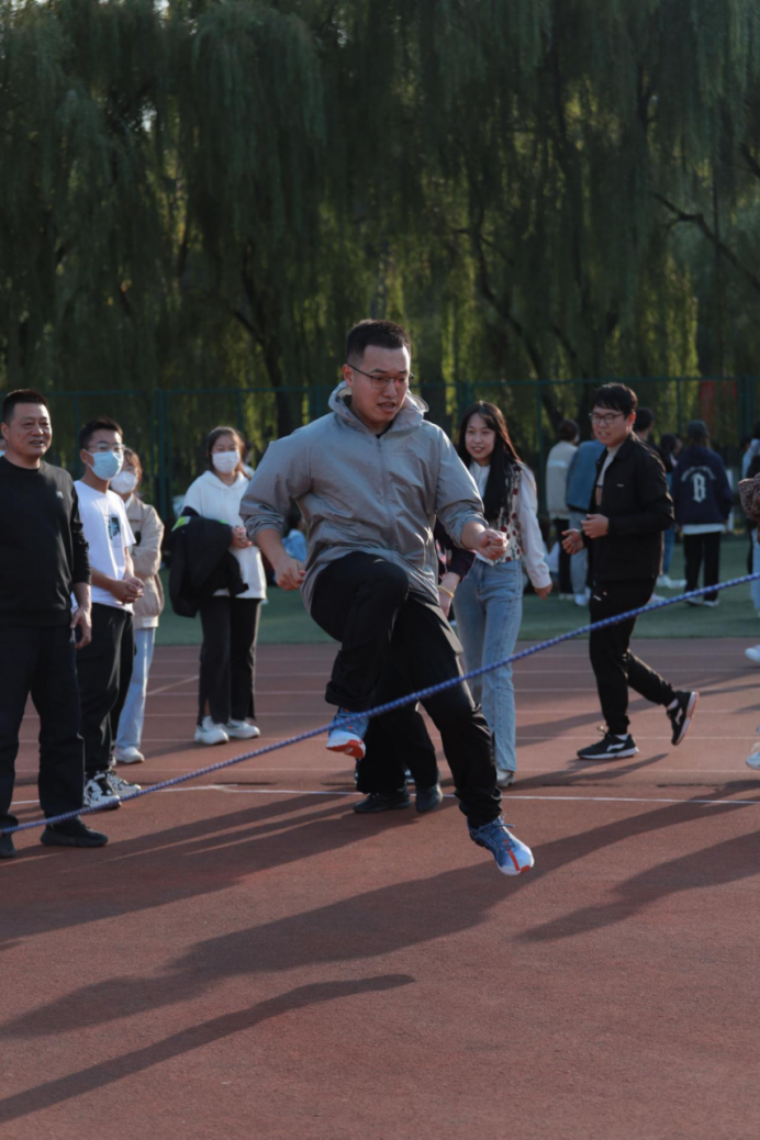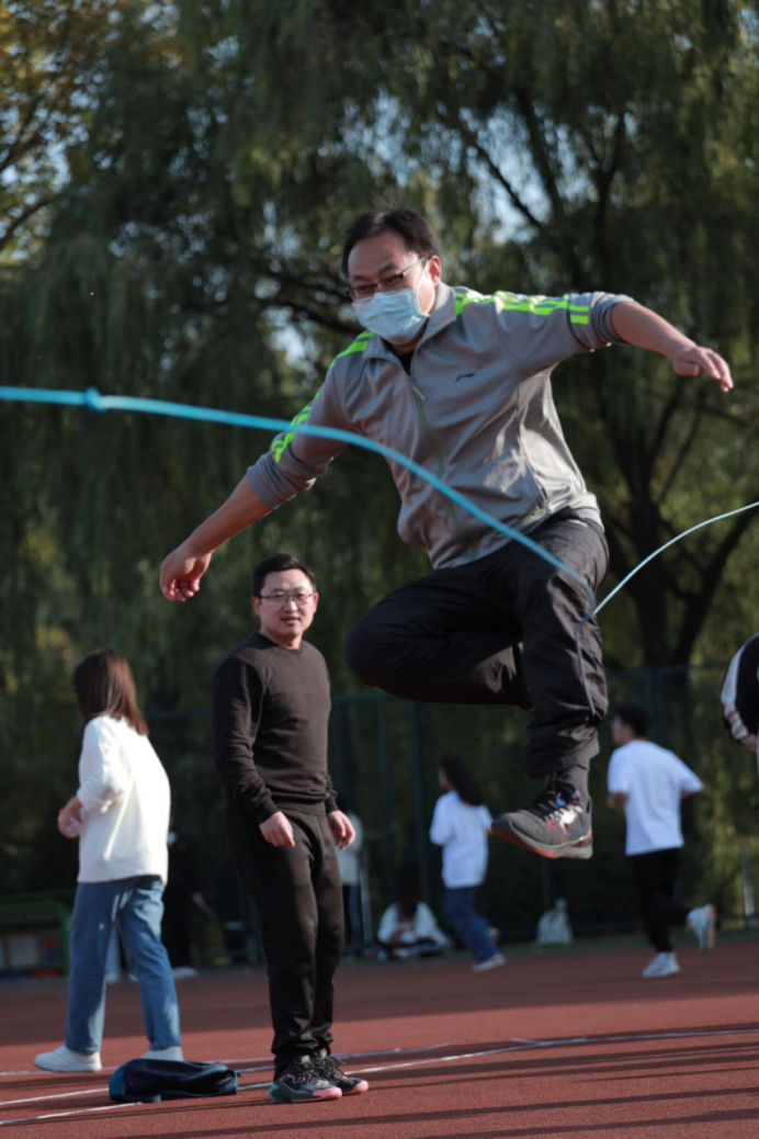 跳大绳,每10人一组,采取“8”字形跳法,场内场外一起喊着“3、2、1”跳,师生们耳听八方,眼观六路,心驰“绳”往,“绳”采飞扬。大家尽情地摇,尽兴地跳,只见绳子甩出完美的弧线,如同长练当空舞。