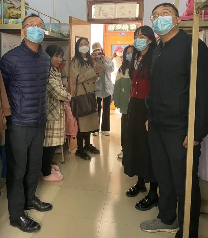 领导老师认真走访每一间宿舍,与同学们进行亲切交流,对同学们线上学习、日常生活、心理情况进行全面了解。同时,对宿舍安全、卫生、用电等问题进行了细致的检查,消除安全隐患。领导老师们详细询问员工出入公寓管理情况,耐心讲解校(院)的防疫政策,了解员工线上教学网络设施配备,鼓励同学们要增强信心,发扬“吃苦奉献、拼搏争先”的精神,齐心协力共克时艰。