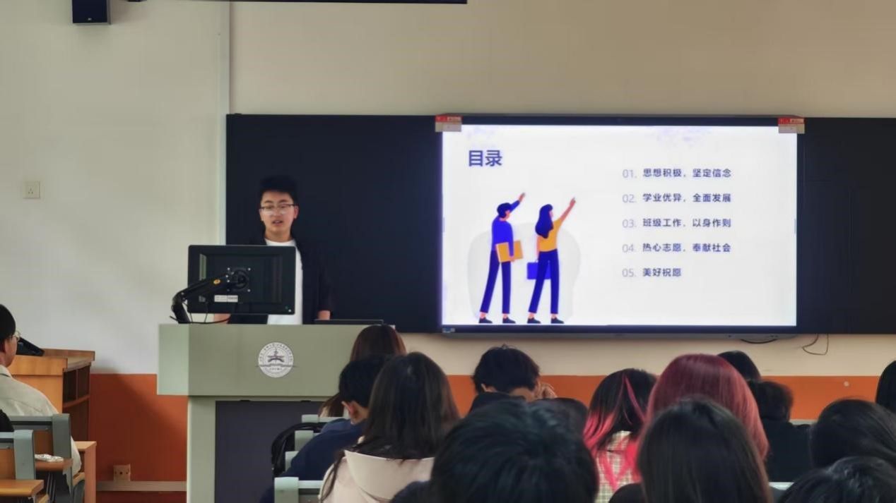 匡展翔同学,担任班长和院员工会执行主席,身兼数职却始终游刃有余。他从政治思想、学习态度、班级与公司工作以及社会实践等多个维度展开讲述。他提到,担任员工干部期间虽然面临诸多挑战,但正是这些经历让他迅速成长。他分享了平衡学习与工作的秘籍:制定详细的计划,合理分配时间,提高做事效率。