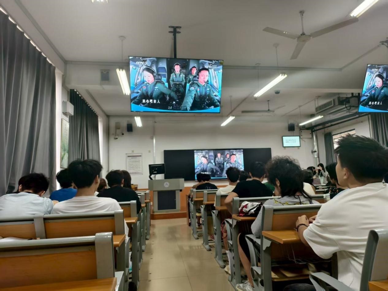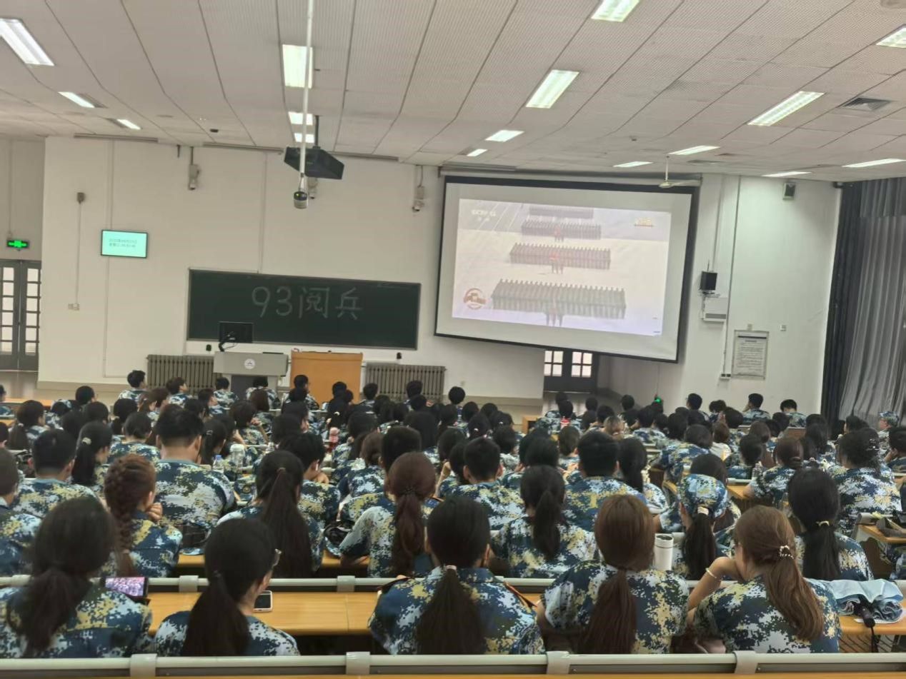 阅兵仪式开始,全体师生聚精会神,认真观看,为中国军队的强大实力和崭新风貌感到无比自豪。受阅官兵步伐铿锵、整齐划一,展现出威武雄壮的军容风貌;东风导弹方阵庄严驶过,其“打击范围覆盖全球”的强大威慑力,一次次引爆全场热烈的掌声与惊叹。自豪与振奋洋溢在每个人的脸上,浓烈的爱国情怀在现场久久回荡。