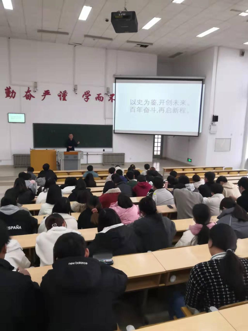 贾庆卫以《百年奋斗 再启新程》为主题,首先和同学们一起学习了党的十九届六中全会公报,重点对中国共产党百年奋斗的历史意义、“十个坚持”的宝贵历史经验进行了学习。结合个人学习心得,贾庆卫从筚路蓝缕、砥砺奋斗的建党初期历史讲起,和大家一起回顾了中国共产党追寻信仰的百年历程;接着,他又从百年奋斗成就的历史经验中如何读懂中国共产党人的“初心密码”进行了解读;最后,他要求同学们要认真学习贯彻习近平新时代中国特色社会主义思想,响应党的伟大号召,从党的百年奋斗历程中汲取走向未来的智慧和力量,在新的征程上再创新辉煌、再续新荣光。