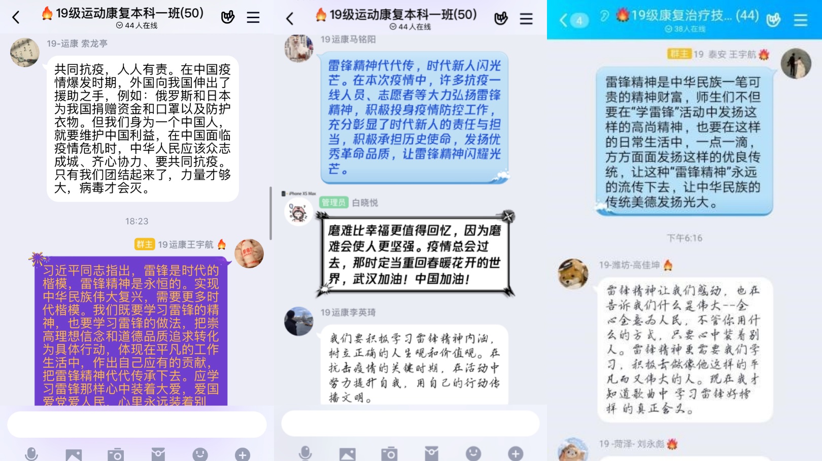 活动期间,同学们踊跃发言,大家讨论“雷锋精神”事例、分享活动心得,并做出了传承雷锋精神的承诺。寒风阵阵,旌旗猎猎,疫情迅猛突袭而来。在战“疫”一线上,有解放军战士、医务人员,也有新闻工作者、社区党员干部,他们不畏艰险、冲锋在前、舍生忘死,他们是值得尊敬的最美“逆行者”,更是雷锋精神的践行者。同学们纷纷表示,这些无私奉献的身影是我们学习的榜样,教会他们要勇于承担使命,不断奋斗拼搏,让青春在奉献中熠熠生辉。作为医员工的我们备受鼓舞,更深感责任重大,虽然不能前去一线支援,但我们会努力在防“疫”一线做一颗履职尽责的“螺丝钉”,贡献自己的一份力量。