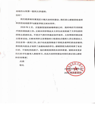 因王树本同学在防疫工作中的出色表现,济南市莱芜区口镇大治村村委会送来了感谢信。面对村委会的褒奖,他表示:“作为山一大运康院的一名员工,未来的日子里我们不仅要将专业知识学好,更应该到祖国最需要的地方去实现人生理想。被称为最美逆行者的医护人员是我们的榜样,是我们内心最敬佩的人!”